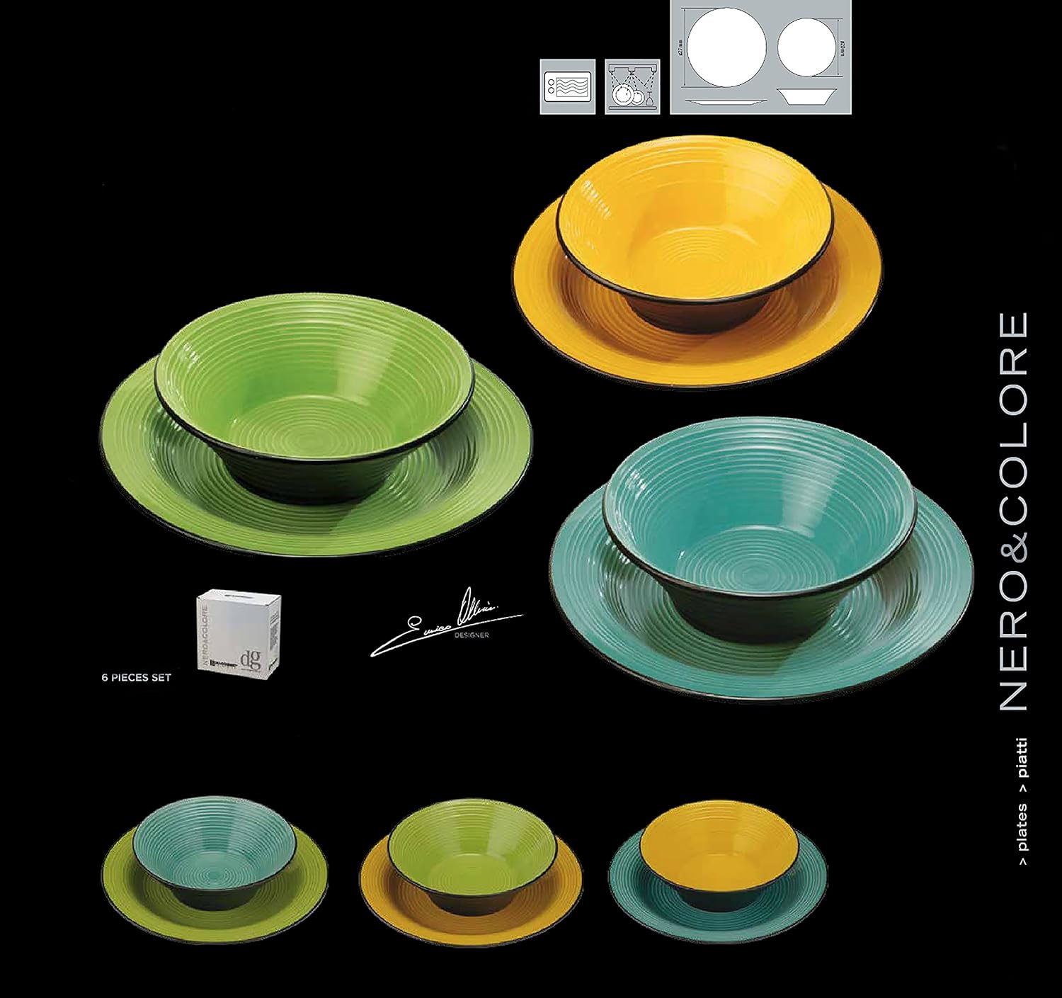 Microwave safe; Resistente; Contenuto confezione: piatti . PIATTI VERDI E ARANCIO NERO COLORE SET PEZZI. Listino: € 316; Prezzo : € 284; Risparmia : € (). Cerchi miglior prezzo Deagourmet NeroColore Set Piatti, Stoneware, Verd da DEAGOURMET?